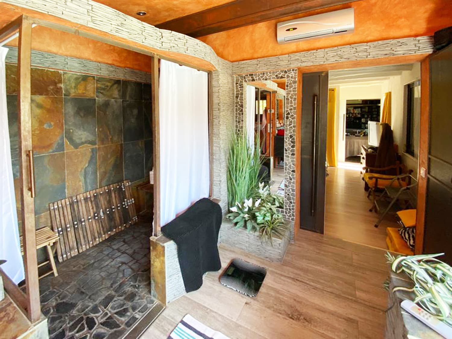 This villa includes: 1 flat of 2 rooms of 30 m2 with its terrace.1 flat of 2 rooms of 55 m2 with its wooden terrace. The main house is composed of a large dining room with a well fitted open plan kitchen, a living room with a fireplace opening onto a beautiful veranda, a bedroom with its own bathroom, an office and a laundry room. A bedroom at the pool level, a pool house bar, a jacuzzi and a shower. A workshop and a garden shed complete this atypical property which is well worth a visit.