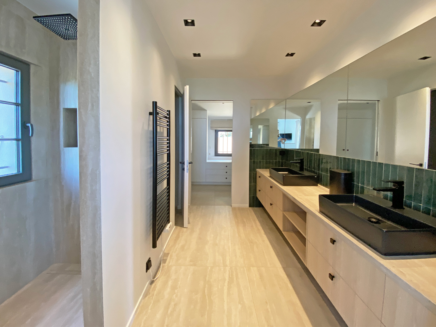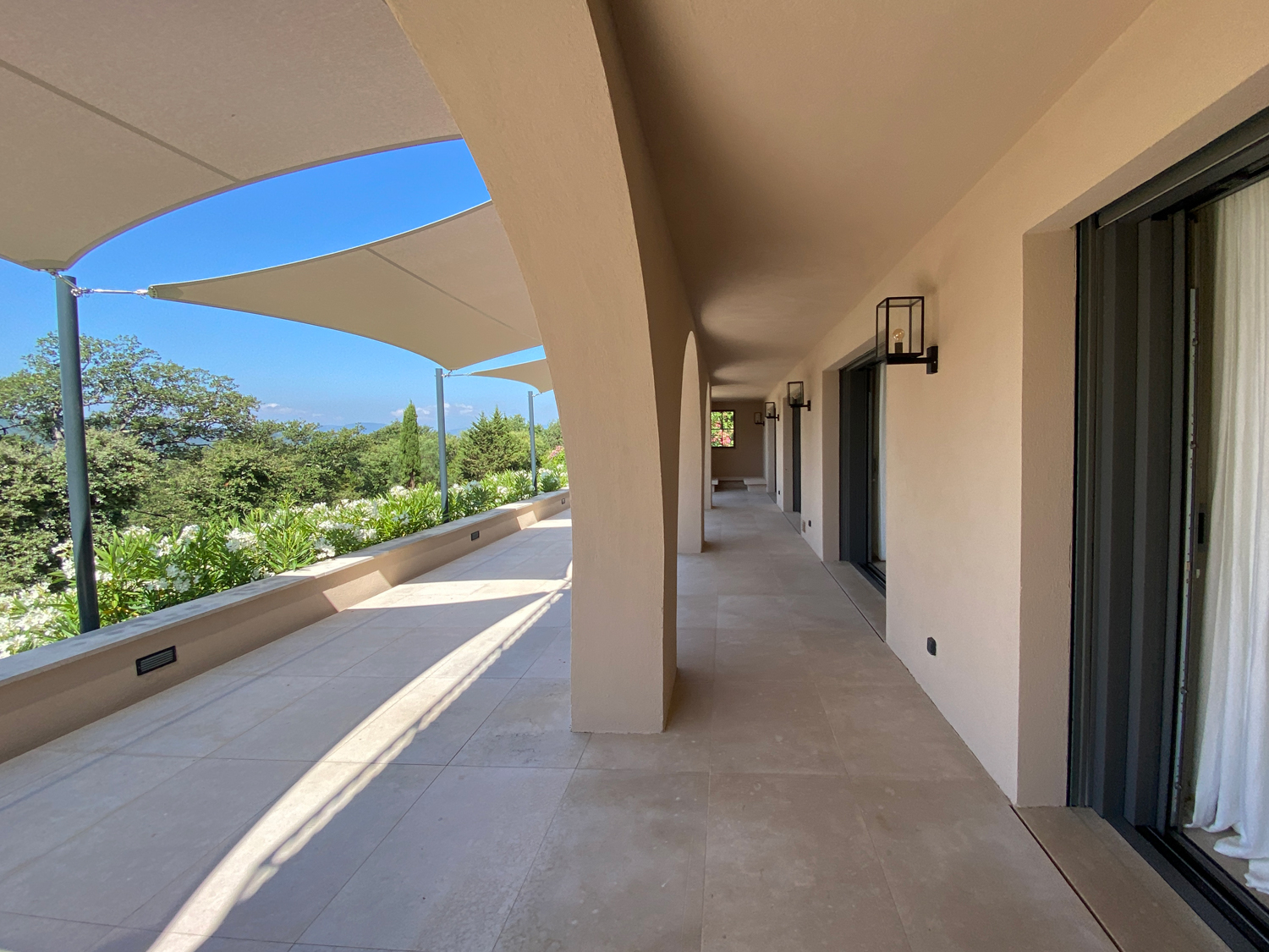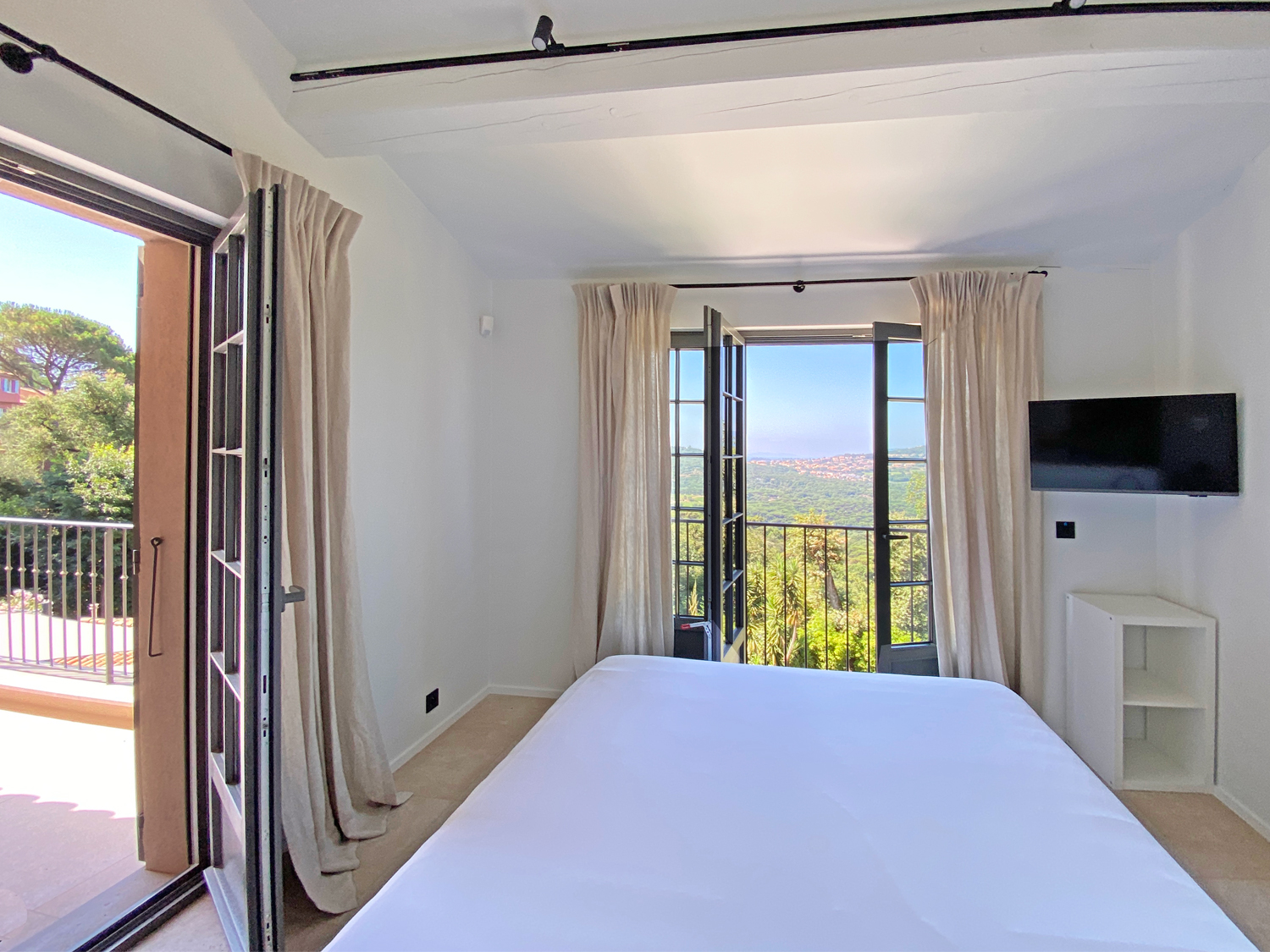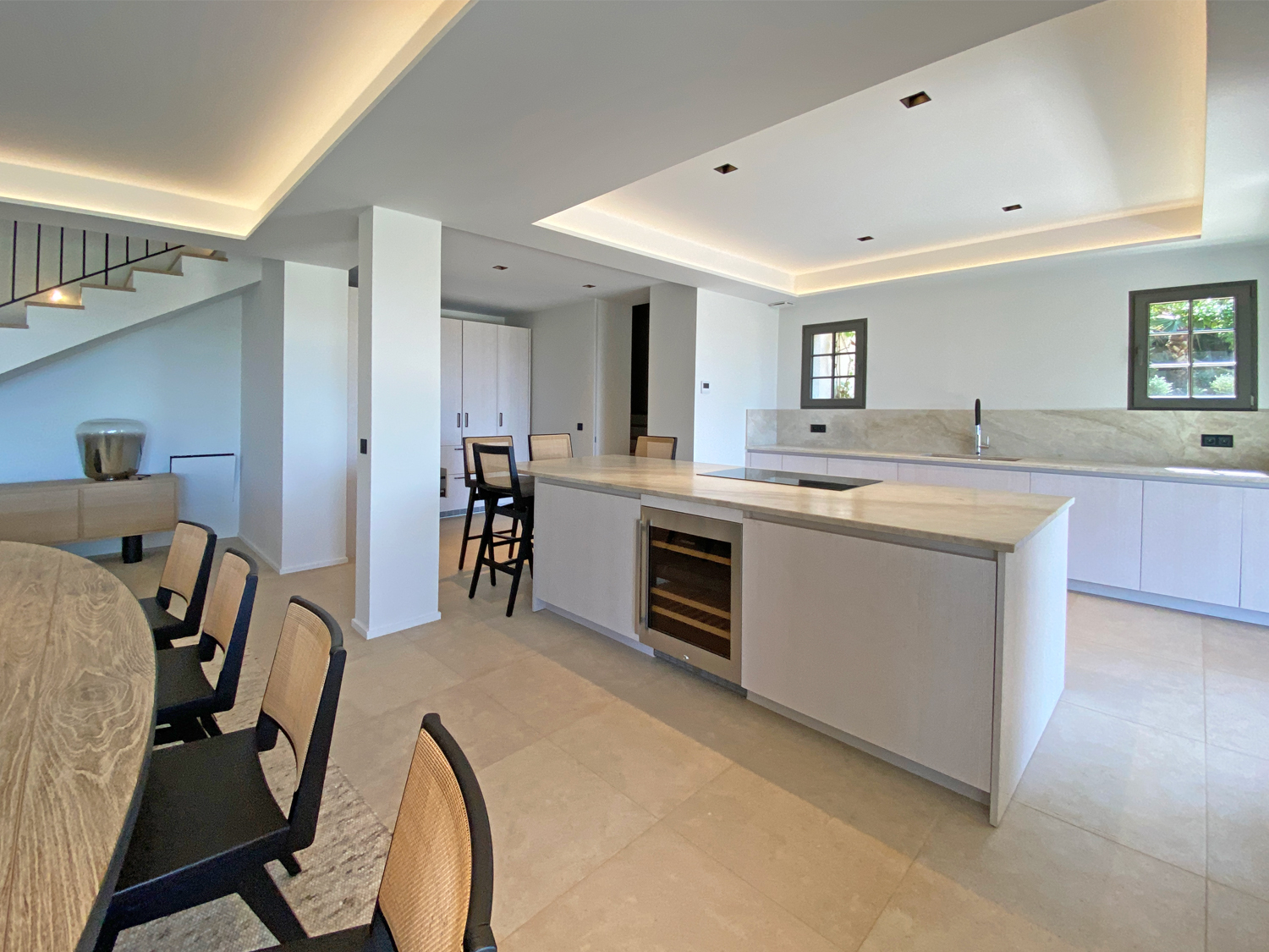 Upstairs, a family suite comprising two bedrooms sharing a shower room enjoys direct access to a private garden. Three other beautiful bedrooms each have a walk-in closet and their own bathroom. All these bedrooms open onto a large shaded terrace offering a splendid sea view.