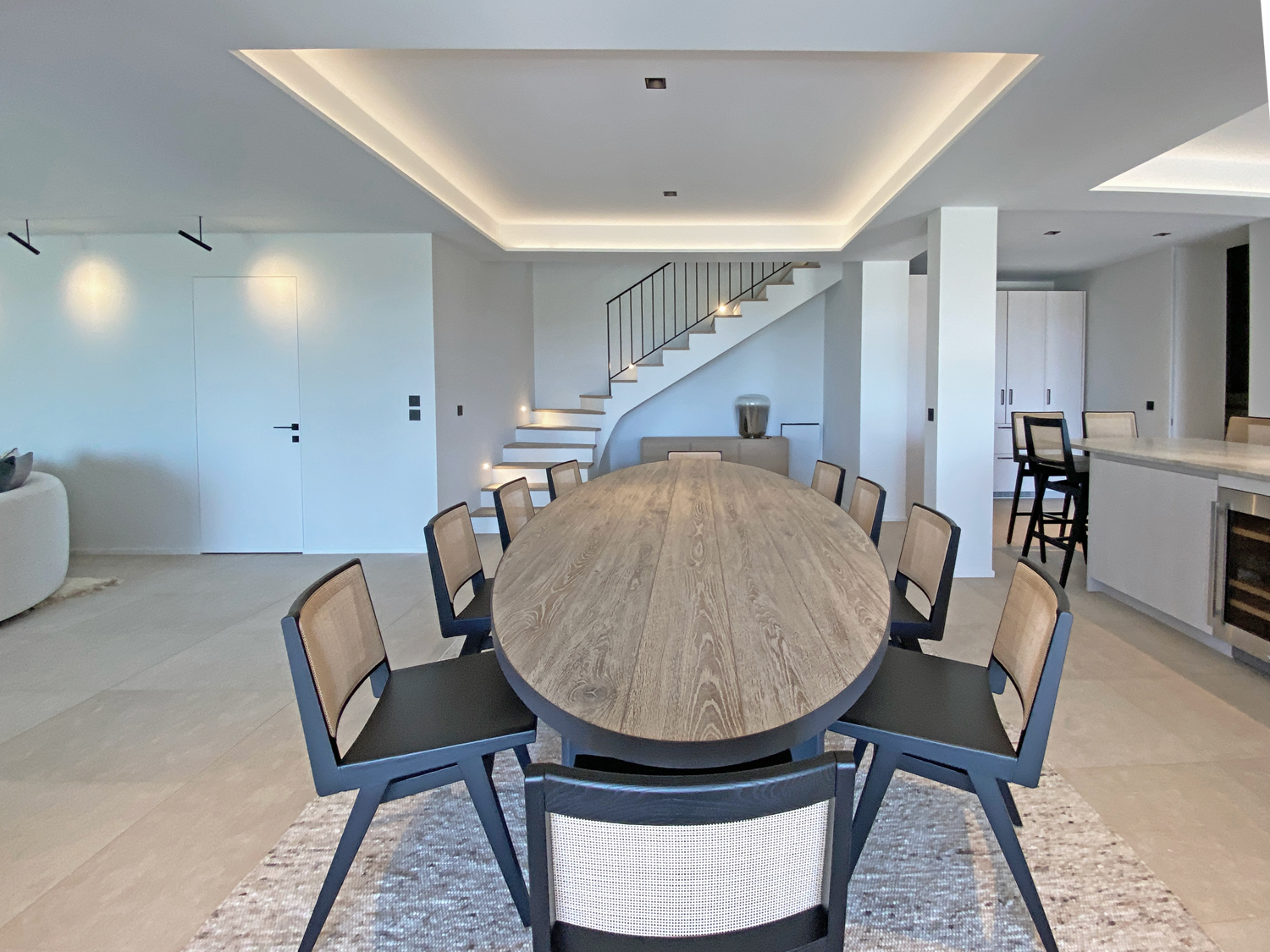 On the ground floor, you are welcomed by a spacious entrance hall, guest toilets, a bright and large living room opening onto an elegant dining area and a modern kitchen with a large central island. At the back, there is a service apartment, ideal for staff, as well as a functional laundry room.
