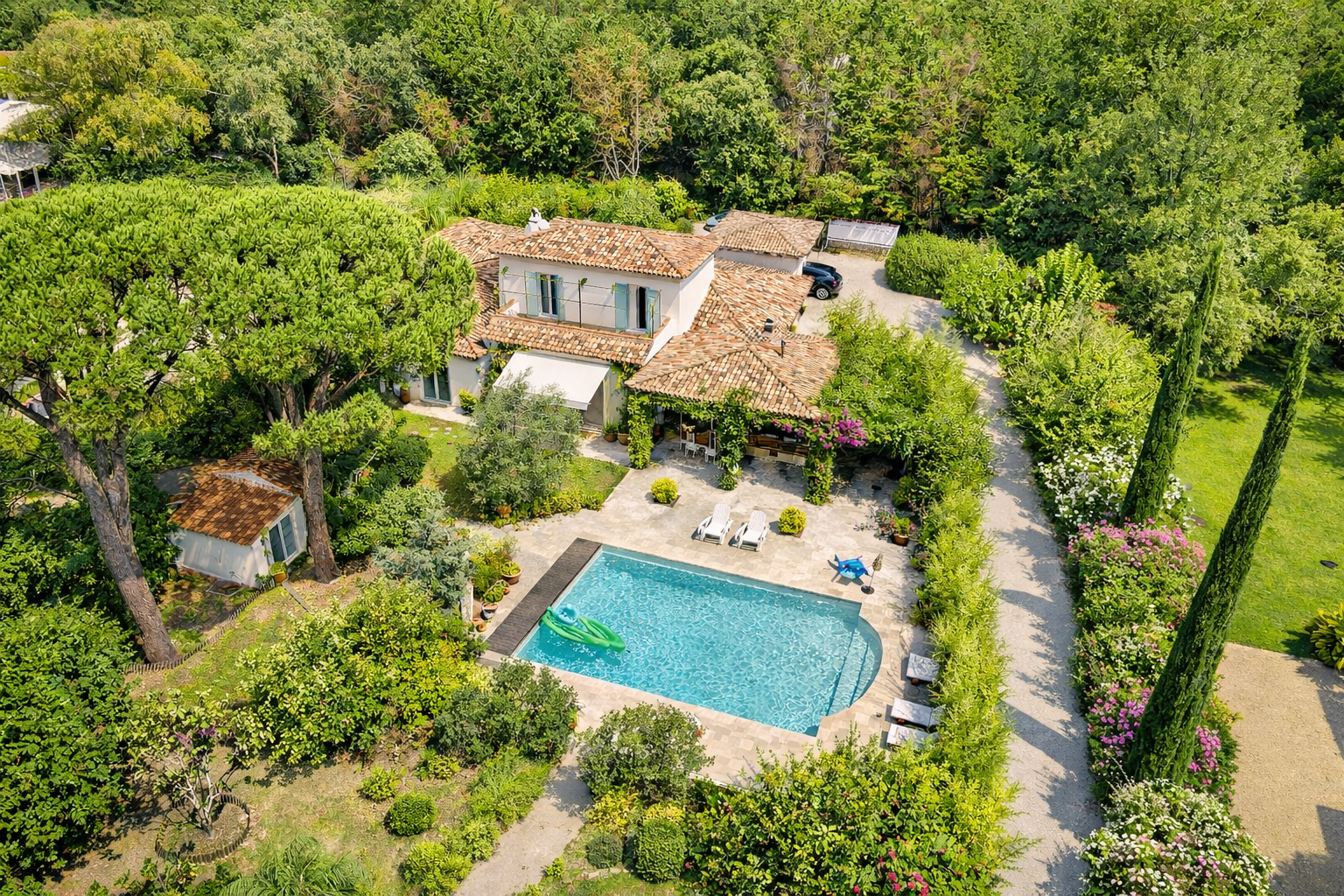 Saut Winter Immobilier vous propose cette villa de luxe entièrement rénovée située dans le Golfe de Saint-Tropez, au cœur d’un environnement résidentiel calme et privilégié. Cette superbe villa d’architecte de 259 m², exposée plein sud, offre des prestations haut de gamme et un cadre de vie exceptionnel à proximité de Saint-Tropez et des plages du Golfe de Saint-Tropez. La propriété dispose d’équipements premium : chauffage au sol, climatisation réversible gainable, piscine chauffée, pool house, garage attenant et carport pour trois véhicules. Implantée sur un magnifique terrain paysager d’environ 4 000 m², accessible par une élégante allée bordée de cyprès, la villa bénéficie d’un environnement verdoyant et d’une grande intimité. Les espaces extérieurs ont été conçus pour profiter pleinement de la douceur de vivre de la Côte d’Azur : * grande terrasse couverte avec salon extérieur et espace réception, * four à pizza et plancha, parfaits pour recevoir, * piscine chauffée 12 x 7 m entourée de larges terrasses, * fontaine décorative avec poissons apportant charme et sérénité au jardin. À l’intérieur, la maison propose des volumes généreux et lumineux.\ L’entrée avec vestiaire mène à un vaste salon organisé en deux espaces : coin cheminée chaleureux et espace télévision. La salle à manger bénéficie d’une vue dégagée sur le jardin et la terrasse, tandis que la cuisine indépendante entièrement équipée s’ouvre également sur l’extérieur. Le rez-de-jardin comprend 3 chambres, dont une suite parentale avec salle de bain et WC séparés, ainsi que deux chambres partageant une salle d’eau. Une grande pièce attenante au salon peut être aménagée en bureau, chambre supplémentaire ou espace de loisirs. À l’étage, une chambre lumineuse avec dressing et terrasse privative dispose de sa propre salle d’eau. Un grand pool house ainsi qu’un chalet indépendant complètent cette propriété et offrent de nombreuses possibilités d’aménagement. Cette villa de prestige dans le Golfe de Saint-Tropez constitue une opportunité rare pour une résidence principale ou secondaire sur la Côte d’Azur. « Les informations sur les risques auxquels ce bien est exposé sont disponibles sur le site Géorisques : [www.georisques.gouv.fr](http://www.georisques.gouv.fr)