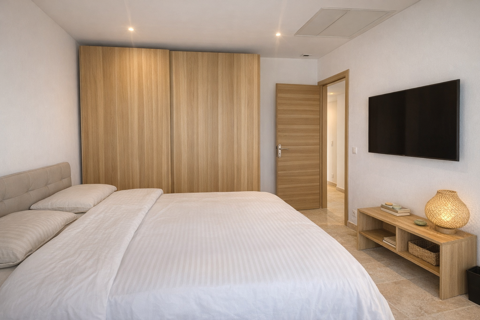 L’espace nuit se compose de **deux chambres**, dont une en mezzanine (**10,7 m² et 7,4 m²**), ainsi que d’une **salle d’eau moderne**.